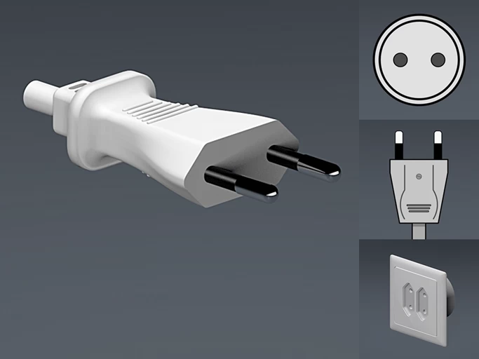 The Type C electrical plug (or Europlug) is a two-wire plug that has two round pins. It fits into any socket that accepts 4.0 – 4.8 mm round contacts on 19 mm centres.