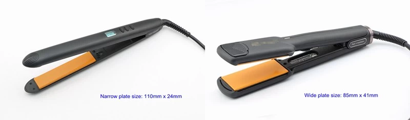 Wide plate hair flat iron: wide plate flat iron are more often to styling long thinker hair, these plate can helps users styling the long hair quickly.