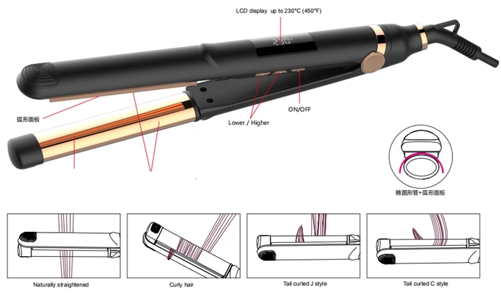 FBT developed a totally new 2 in 1 hair styler this Oct. It is with “C” shape curved upper plates and an oval shape barrel. The iron is specialied for natural straightening, for styling and doing C curls, J curls. The design is unique and special, different from the models you can see in the market. Attached please find the picture.