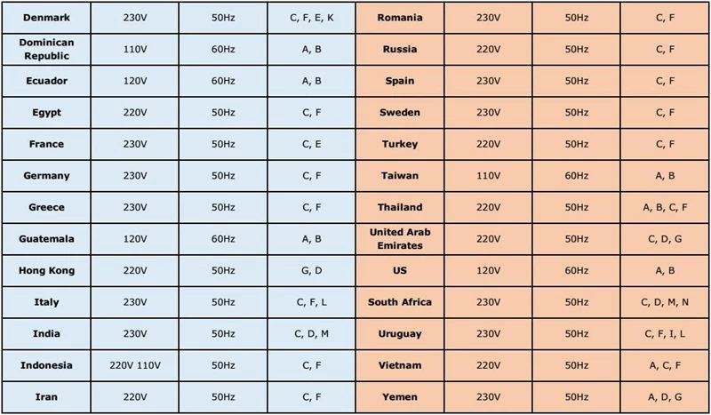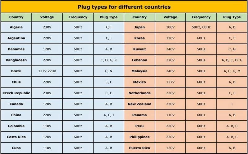 Here is an overview of all countries of the world and their respective plugs/outlets and voltages/frequencies used for domestic appliances.