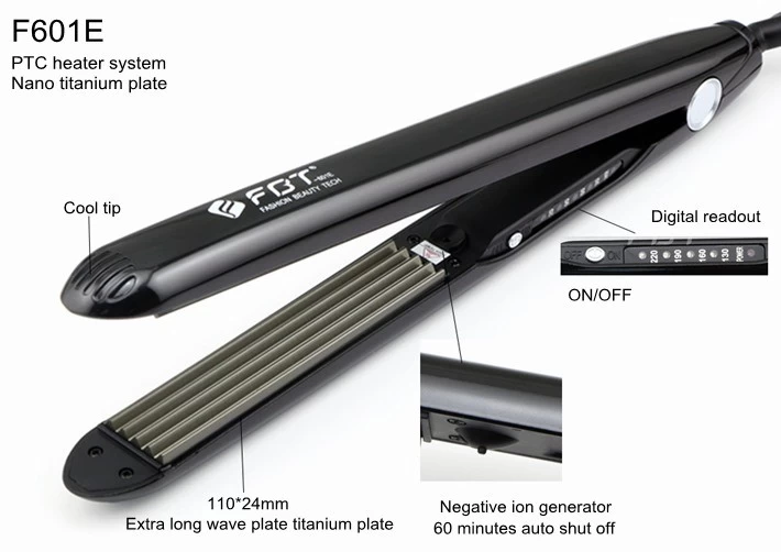 FBT make this extra long wave plate hair iron, for crimp hair styling effect, we do this product with strong negative ion generator, nano titanium plate and have great heat conduction function and nano-corrosion and scratch resistant advantages, humanity design, which is hot selling all over the world.