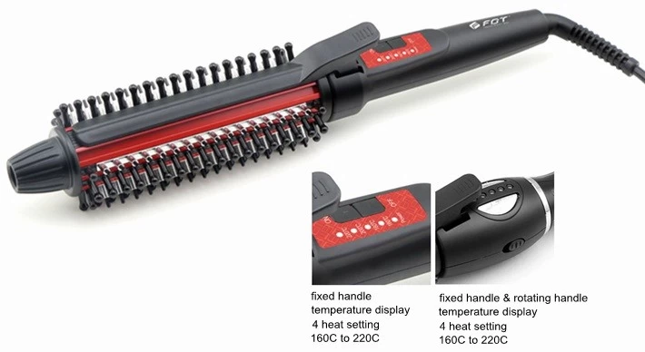 FBT is a professional hair styling iron factory manufacturing and design products with advanced technology and fashion ideas for 12 years. This high end round heated hair brush we made not only can do different barrel size, but also have different handle and temperature display for our client option, one for fixed handle, flat temperature display with 4 heat setting from 160C to 220C, another for adjustable fixed handle and rotating handle controled by buttom, and also 4 light digital temperature display which is different from above as the picture shown.