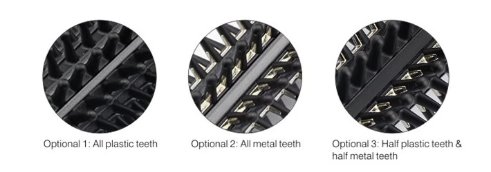 All of the heated round brush or heated flat brush manufacturing by FBT have 3 different teeth option: option one is all plastic teeth, option two is all metal teeth, and option three is half plastic teeth plus half metal teeth. Client can choose the metal teeth accordingly. All of the metal teeth or plastic teeth we made with high end quality.