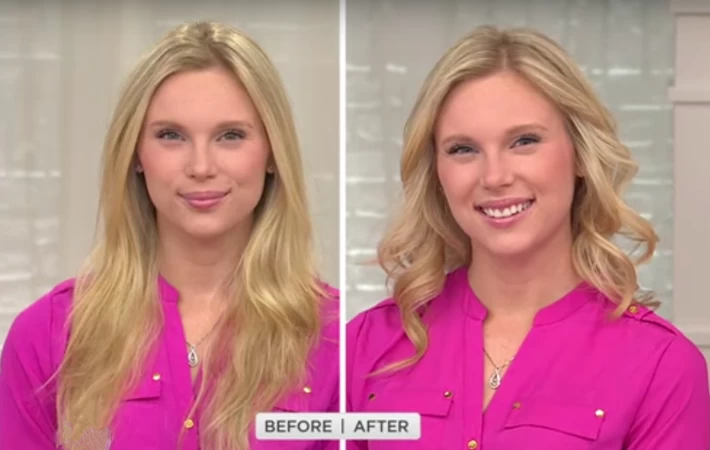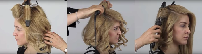 Take another inch of hair, slowly around the heated hair brush through it, smooth the hair slowly and twist when get about half way through, and turn the heated round hair brush towards the opposite way, but only twist your hair around hair once, hold for several seconds, you could pull the hair brush down, and then, there is the little curl at the bottom.