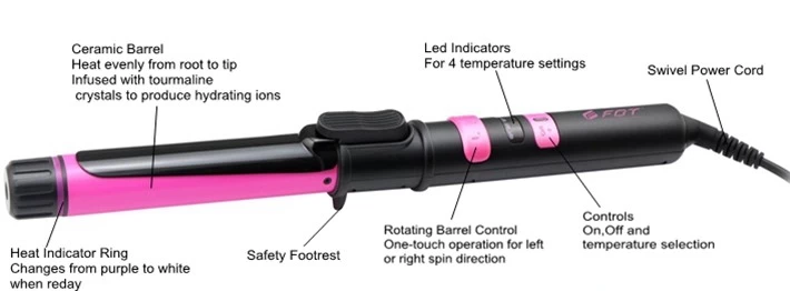 Onetouch magical hair curler F998EA is patented by FBT, The specialty isrotating barrel ,it is one touch operation for left or right spindirection.