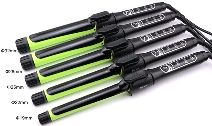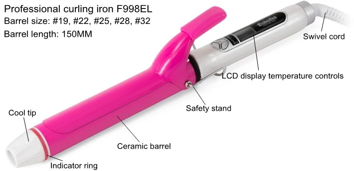We have 5 barrel size of F998EL for your choice, different size of cueling iron for different hair type. 19mm and 22mm for tight and small curls, 28mm and 32mm for lossen curls.