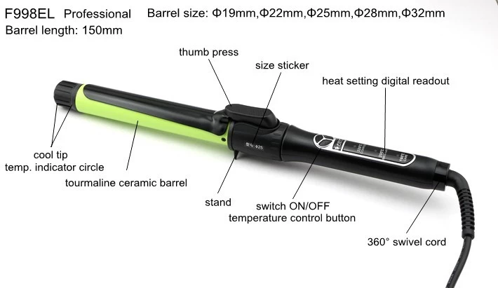 Professional salon usage tourmaline ceramic hair curling iron F998EL