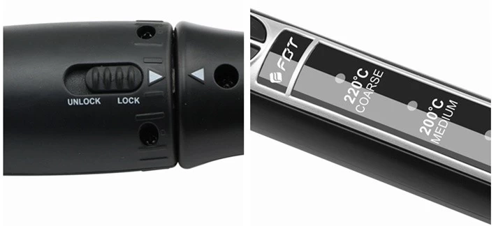 F998EL is heating curler with 3 different temperature setting, they are, 180C 356F hair care temperature, 200C 390F medium temperature, and stabilized 220C 430F coarse temperature. Another is the handle and clamp setting, the humanity rotating handle and fixed handle design, all users can choose their way using rotating handle ro fixed handle by just press the button.
