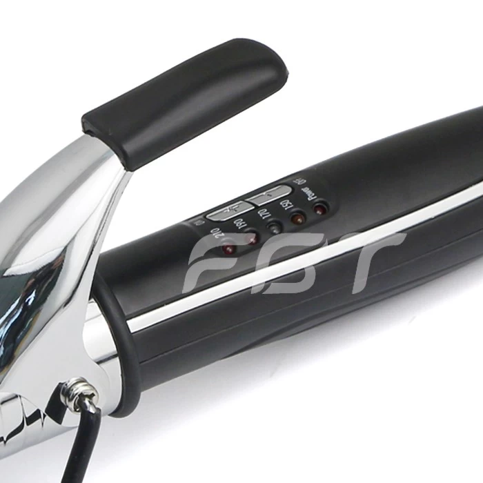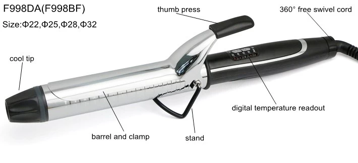 FBT manufacturing professional mirror titanium coating barrel hair curling iron F998DA is a breakthrough in hair styling, Φ28mm barrel size will allow you to style loose and large curls, there are two keys to control the temperature setting and power ON/OFF.