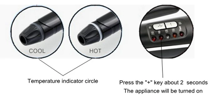 1. We need to wash your hair and dry it, then brush your hair smooth. Press key “+” about 2 seconds to switch on the hair wand.