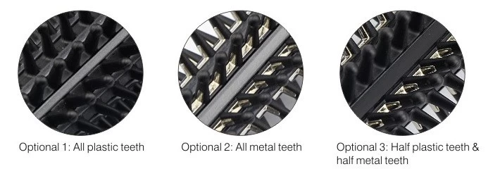 It has three options of the teeth, all plastic teeth, all metal teeth and half plastic plus half metal teeth.